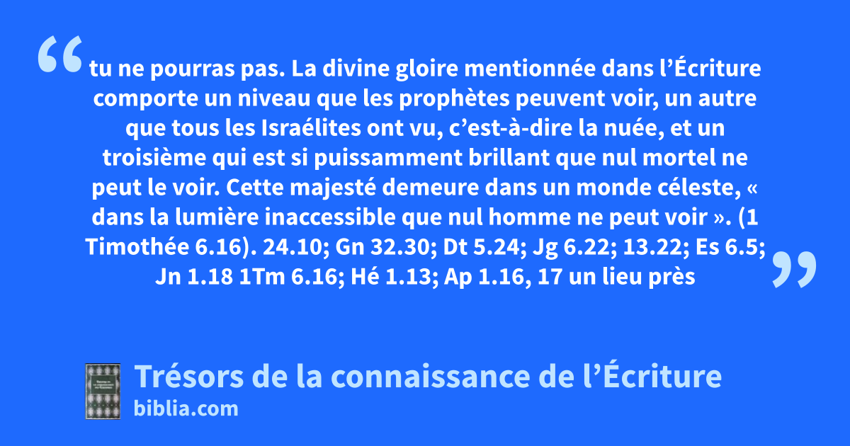 tu ne pourras pas. La divine gloire mentionnée dans l’Écriture comporte un niveau que les prophètes peuvent voir, un autre que tous les Israélites ont vu, c’est-à-dire la nuée, et un troisième qui est si puissamment brillant que nul mortel ne peut le voir. Cette majesté demeure dans un monde céleste, « dans la lumière inaccessible que nul homme ne peut voir ». (1 Timothée 6.16). 24.10; Gn 32.30; Dt 5.24; Jg 6.22; 13.22; Es 6.5; Jn 1.18 1Tm 6.16; Hé 1.13; Ap 1.16, 17