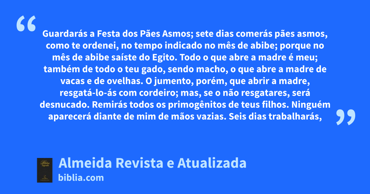18 Guardarás a Festa dos Pães Asmosd; sete dias comerás pães asmos, como te ordenei, no tempo indicado no mês de abibe; porque no mês de abibe saíste do Egito. 19 Todo o que abre a madre é meu; também de todo o teu gado, sendo macho, o que abre a madre de vacas e de ovelhas. 20 O jumento, porém, que abrir a madre, resgatá-lo-ás com cordeiro; mas, se o não resgatares, será desnucado. Remirás todos os primogênitos de teus filhos. Ninguém aparecerá diante de mim de mãos vazias.e