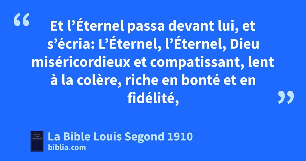 1aL’Éternel dit à Moïse: Taille deux tables de pierre comme les premières, et j’y écrirai les paroles qui étaient sur les premières tables que tu as brisées. 2Sois prêt de bonne heure, et tu monteras dès le matin sur la montagne de Sinaï; tu te tiendras là devant moi, sur le sommet de la montagne. 3bQue personne ne monte avec toi, et que personne ne paraisse sur toute la montagne; cet même que ni brebis ni boeufs ne paissent près de cette montagne. 4Moïse tailla deux tables de pierre comme les premières; il se leva de bon matin, et monta sur la montagne de Sinaï, selon l’ordre que l’Éternel lui avait donné, et il prit dans sa main les deux tables de pierre. 5L’Éternel descendit dans une nuée, se tint là auprès de lui, et proclama le nom de l’Éternel. 6dEt l’Éternel passa devant lui, et s’écria: L’Éternel, l’Éternel, Dieu miséricordieux et compatissant, lent à la colère, riche en bonté et en fidélité, 7equi conserve son amour jusqu’à mille générations, qui pardonne l’iniquité, la rébellion et le péché, mais qui ne tient point le coupable pour innocent, et fqui punit l’iniquité des pères sur les enfants et sur les enfants des enfants jusqu’à la troisième et à la quatrième génération!