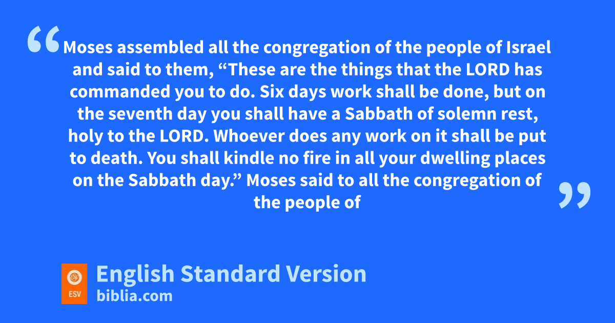 35 Moses assembled all the congregation of the people of Israel and said to them, b“These are the things that the Lord has commanded you to do. 2 cSix days work shall be done, but on the seventh day you shall have a Sabbath of solemn rest, holy to the Lord. Whoever does any work on it shall be put to death. 3 dYou shall kindle no fire in all your dwelling places on the Sabbath day.”