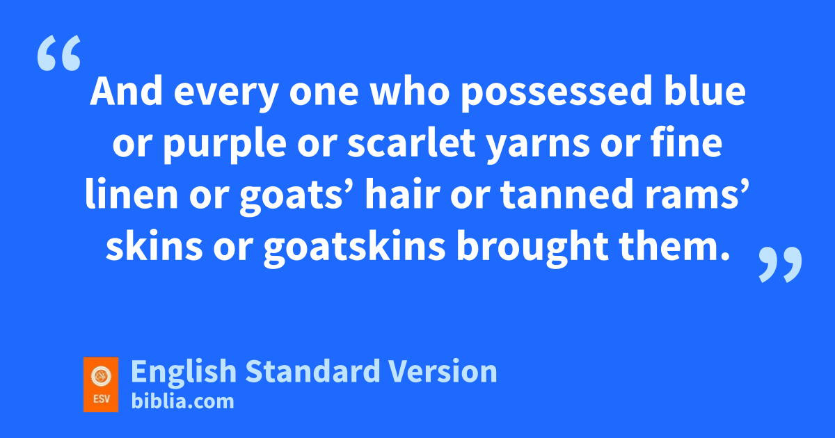 20 Then all the congregation of the people of Israel departed from the presence of Moses. 21 And they came, yeveryone whose heart stirred him, and everyone whose spirit moved him, zand brought the Lord’s contribution to be used for the tent of meeting, and for all its service, and for the holy garments. 22 So they came, both men and women. All who were of a willing heart brought brooches and earrings and signet rings and armlets, all sorts of gold objects, every man dedicating an offering of gold to the Lord. 23 And aevery one who possessed bblue or purple or scarlet yarns or fine linen or goats’ hair or tanned rams’ skins or goatskins brought them. 24 cEveryone who could make a contribution of silver or bronze brought it as the Lord’s contribution. And every one who possessed acacia wood of any use in the work brought it. 25 And every dskillful woman spun with her hands, and they all brought what they had spun in blue and purple and scarlet yarns and fine twined linen. 26 All the women ywhose hearts stirred them to use their skill spun the goats’ hair. 27 And the eleaders brought onyx stones and stones to be set, for the ephod and for the breastpiece, 28 and spices and oil for the light, and for the anointing oil, and for the fragrant incense. 29 fAll the men and women, the people of Israel, whose heart moved them to bring anything for the work that the Lord had commanded by Moses to be done brought it as a freewill offering to the Lord.