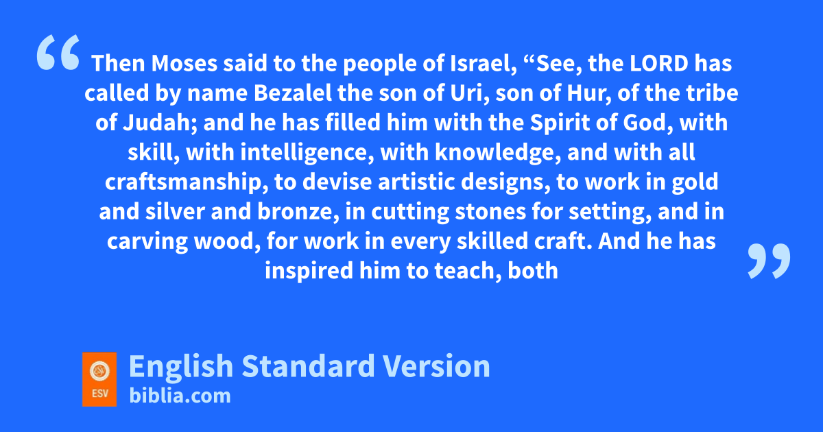 30 gThen Moses said to the people of Israel, “See, the Lord has called by name Bezalel the son of Uri, son of Hur, of the tribe of Judah; 31 and he has filled him with the Spirit of God, with hskill, with intelligence, with knowledge, and with all craftsmanship, 32 to devise artistic designs, to work in gold and silver and bronze, 33 in cutting stones for setting, and in carving wood, for work in every skilled craft. 34 And he has inspired him to teach, both him and Oholiab the son of Ahisamach of the tribe of Dan. 35 He has hfilled them with skill to do every sort of work done by an engraver or by a designer or by an embroiderer in blue and purple and scarlet yarns and fine twined linen, or by a weaver—by any sort of workman or skilled designer.