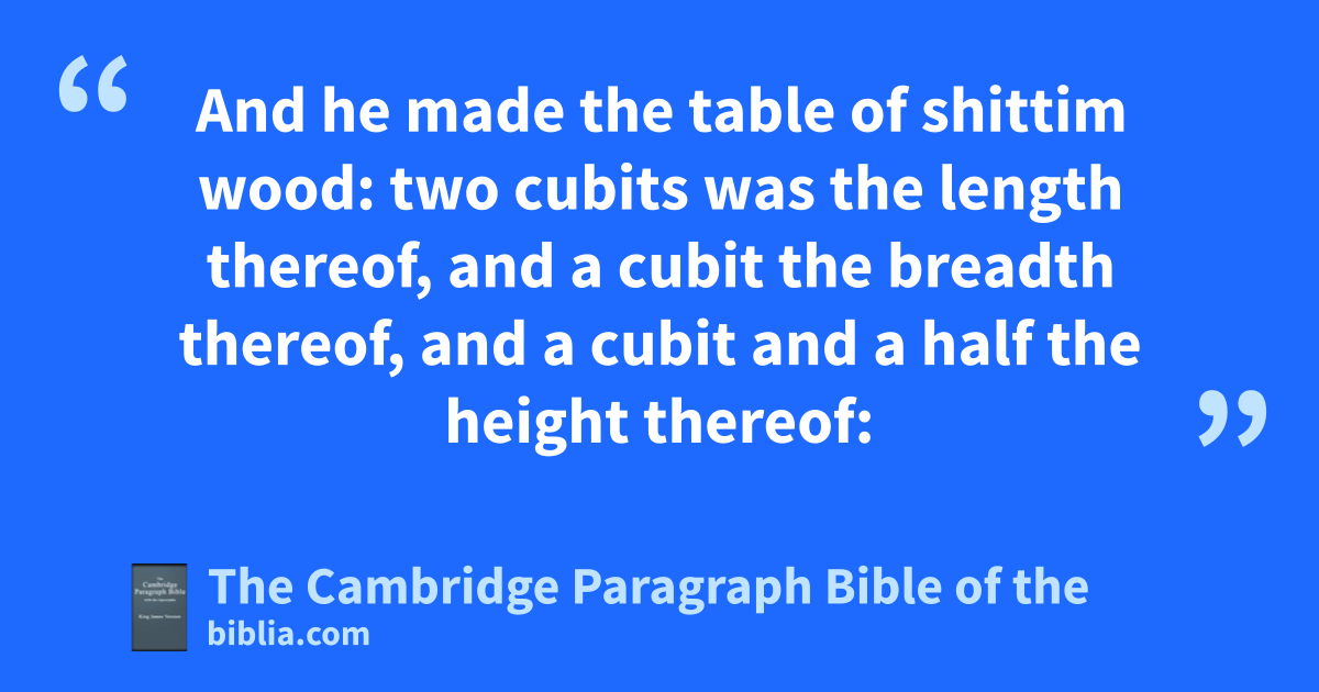 10 cAnd he made the table of shittim wood: two cubits was the length thereof, and a cubit the breadth thereof, and a cubit and a half the height thereof: 11 and he overlaid it with pure gold, and made thereunto a crown of gold round about. 12 Also he made thereunto a border of a handbreadth round about; and made a crown of gold for the border thereof round about. 13 And he cast for it four rings of gold, and put the rings upon the four corners that were in the four feet thereof. 14 Over against the border were the rings, the places for the staves to bear the table. 15 And he made the staves of shittim wood, and overlaid them with gold, to bear the table. 16 And he made the vessels which were upon the table, his dishes, and his spoons, and his bowls, and his covers * to cover withal, of pure gold.