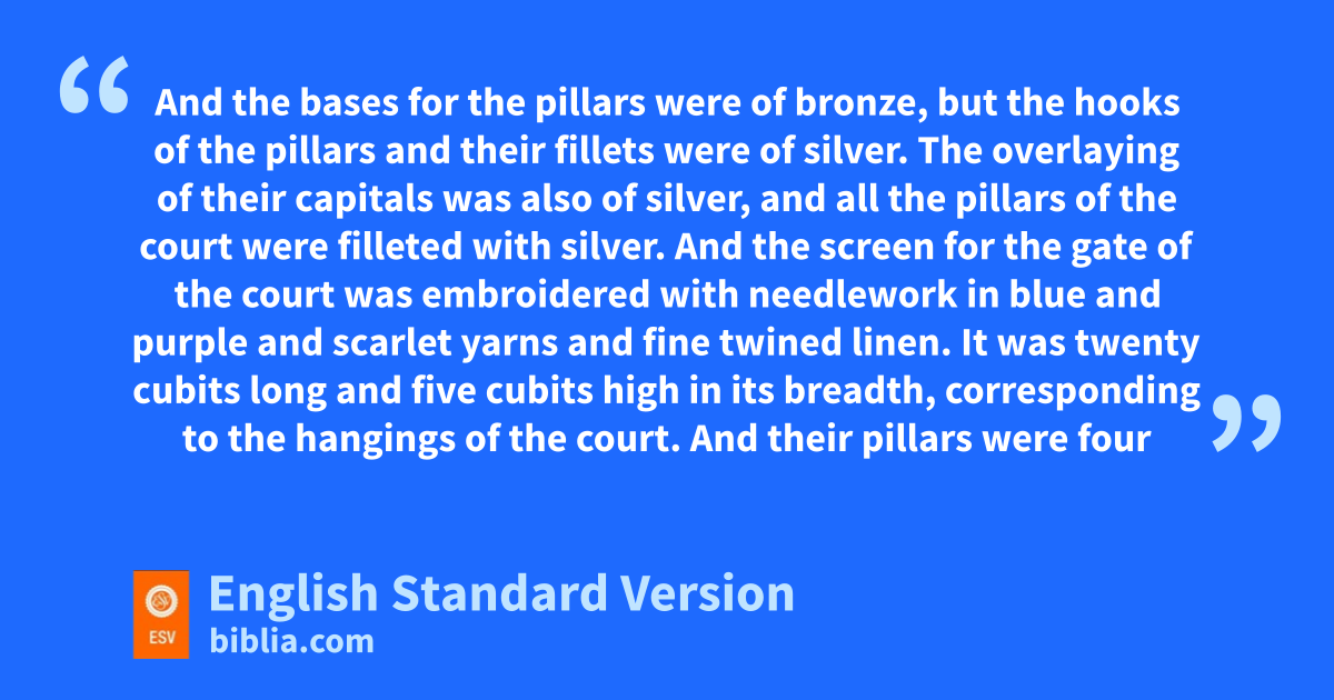 9 cAnd he made the court. For the south side the hangings of the court were of fine twined linen, a hundred cubits; 10 their twenty pillars and their twenty bases were of bronze, but the hooks of the pillars and their fillets were of silver. 11 And for the north side there were hangings of a hundred cubits; their twenty pillars and their twenty bases were of bronze, but the hooks of the pillars and their fillets were of silver. 12 And for the west side were hangings of fifty cubits, their ten pillars, and their ten bases; the hooks of the pillars and their fillets were of silver. 13 And for the front to the east, fifty cubits. 14 The hangings for one side of the gate were fifteen cubits, with their three pillars and three bases. 15 And so for the other side. On both sides of the gate of the court were hangings of fifteen cubits, with their three pillars and their three bases. 16 All the hangings around the court were of fine twined linen. 17 And the bases for the pillars were of bronze, but the hooks of the pillars and their fillets were of silver. The overlaying of their capitals was also of silver, and all the pillars of the court were filleted with silver. 18 And the screen for the gate of the court was embroidered with needlework in blue and purple and scarlet yarns and fine twined linen. It was twenty cubits long and five cubits high in its breadth, corresponding to the hangings of the court. 19 And their pillars were four in number. Their four bases were of bronze, their hooks of silver, and the overlaying of their capitals and their fillets of silver. 20 And all the pegs for the tabernacle and for the court all around were of bronze.
