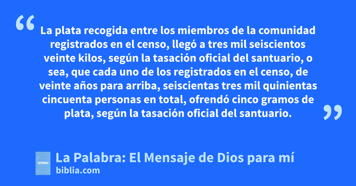25 La plata recogida entre los miembros de la comunidad registrados en el censo, llegó a tres mil seiscientos veinte kilos, según la tasación oficial del santuario, 26 o sea, que cada uno de los registrados en el censo, de veinte años para arriba, seiscientas tres mil quinientas cincuenta personas en total, ofrendó cinco gramos de plata, según la tasación oficial del santuario. 27 Con tres mil cuatrocientos kilos de plata se fundieron las basas para el santuario y las basas que sostenían las cortinas, a razón de treinta y cuatro kilos por basa; 28 y con los doscientos veinte kilos de plata restantes se hicieron los ganchos y las molduras de las columnas y se revistieron los capiteles.