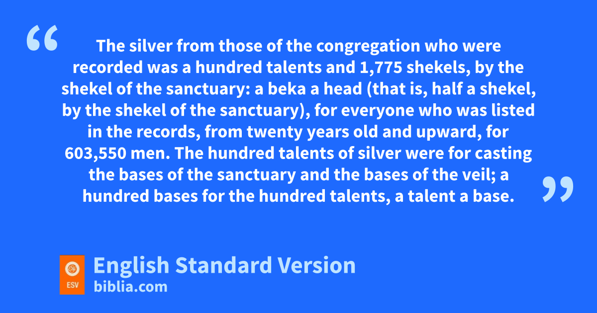 24 All the gold that was used for the work, in all the construction of the sanctuary, the gold from the offering, was twenty-nine talents and 730 shekels,2 by gthe shekel of the sanctuary. 25 The silver from those of the congregation who were recorded was a hundred talents and 1,775 shekels, by the shekel of the sanctuary: 26 a gbeka3 a head (that is, half a shekel, by the shekel of the sanctuary), for everyone who was listed in the records, from twenty years old and upward, for h603,550 men. 27 The hundred talents of silver were for casting the ibases of the sanctuary and the bases of the veil; a hundred bases for the hundred talents, a talent a base. 28 And of the 1,775 shekels he made hooks for the pillars and overlaid their capitals and made fillets for them. 29 The bronze that was offered was seventy talents and 2,400 shekels; 30 with it he made the jbases for the entrance of the tent of meeting, kthe bronze altar and the bronze grating for it and all the utensils of the altar, 31 the lbases around the court, and the mbases of the gate of the court, all the npegs of the tabernacle, and all the pegs around the court.