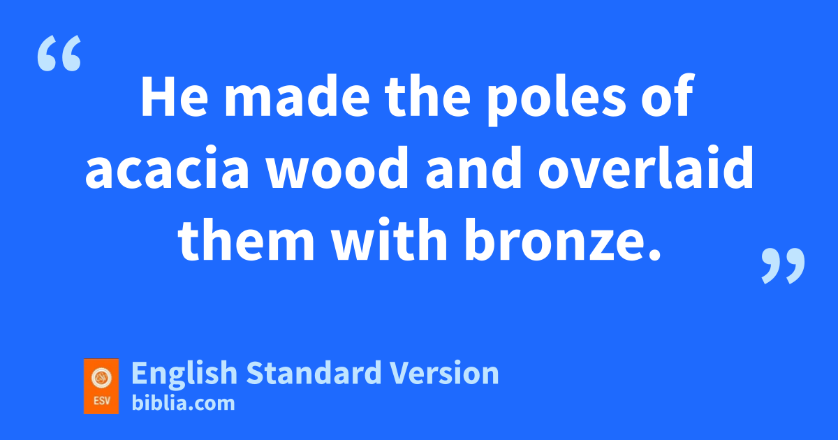 38 zHe made the altar of burnt offering of acacia wood. Five cubits1 was its length, and five cubits its breadth. It was square, and three cubits was its height. 2 He made horns for it on its four corners. Its horns were of one piece with it, and he overlaid it with bronze. 3 And he made all the utensils of the altar, the pots, the shovels, the basins, the forks, and the fire pans. He made all its utensils of bronze. 4 And he made for the altar a grating, a network of bronze, under its ledge, extending halfway down. 5 He cast four rings on the four corners of the bronze grating as holders for the poles. 6 He made the poles of acacia wood and overlaid them with bronze. 7 And he put the poles through the rings on the sides of the altar to carry it with them. He made it hollow, with boards.