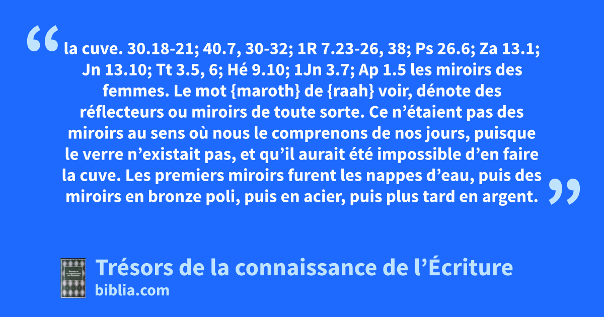 la cuve. 30.18-21; 40.7, 30-32; 1R 7.23-26, 38; Ps 26.6; Za 13.1; Jn 13.10; Tt 3.5, 6; Hé 9.10; 1Jn 3.7; Ap 1.5 les miroirs des femmes. Le mot {maroth} de {raah} voir, dénote des réflecteurs ou miroirs de toute sorte. Ce n’étaient pas des miroirs au sens où nous le comprenons de nos jours, puisque le verre n’existait pas, et qu’il aurait été impossible d’en faire la cuve. Les premiers miroirs furent les nappes d’eau, puis des miroirs en bronze poli, puis en acier, puis plus tard en argent. qui s’assemblaient. Il est supposé que ces femmes montaient la garde pendant la nuit. Dans les temps anciens, les femmes étaient souvent utilisées comme gardiennes aux portes. 1S 2.22; Pr 8.34; Mt 26.69; Lc 2.37; Jn 18.16; 1Tm 5.5