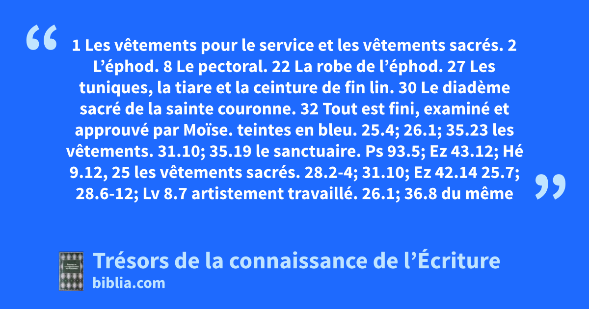 1 Les vêtements pour le service et les vêtements sacrés. 2 L’éphod. 8 Le pectoral. 22 La robe de l’éphod. 27 Les tuniques, la tiare et la ceinture de fin lin. 30 Le diadème sacré de la sainte couronne. 32 Tout est fini, examiné et approuvé par Moïse.