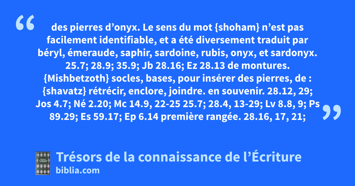des pierres d’onyx. Le sens du mot {shoham} n’est pas facilement identifiable, et a été diversement traduit par béryl, émeraude, saphir, sardoine, rubis, onyx, et sardonyx. 25.7; 28.9; 35.9; Jb 28.16; Ez 28.13 de montures. {Mishbetzoth} socles, bases, pour insérer des pierres, de : {shavatz} rétrécir, enclore, joindre.