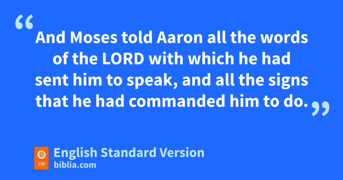 27 The Lord said to Aaron, “Go into the wilderness jto meet Moses.” So he went and met him at the kmountain of God and kissed him. 28 And Moses ltold Aaron all the words of the Lord with which he had sent him to speak, and all mthe signs that he had commanded him to do. 29 Then Moses and Aaron nwent and gathered together all the elders of the people of Israel. 30 oAaron spoke all the words that the Lord had spoken to Moses and did the signs in the sight of the people. 31 And the people pbelieved; and when they heard that the Lord had qvisited the people of Israel and that he had rseen their affliction, sthey bowed their heads and worshiped.