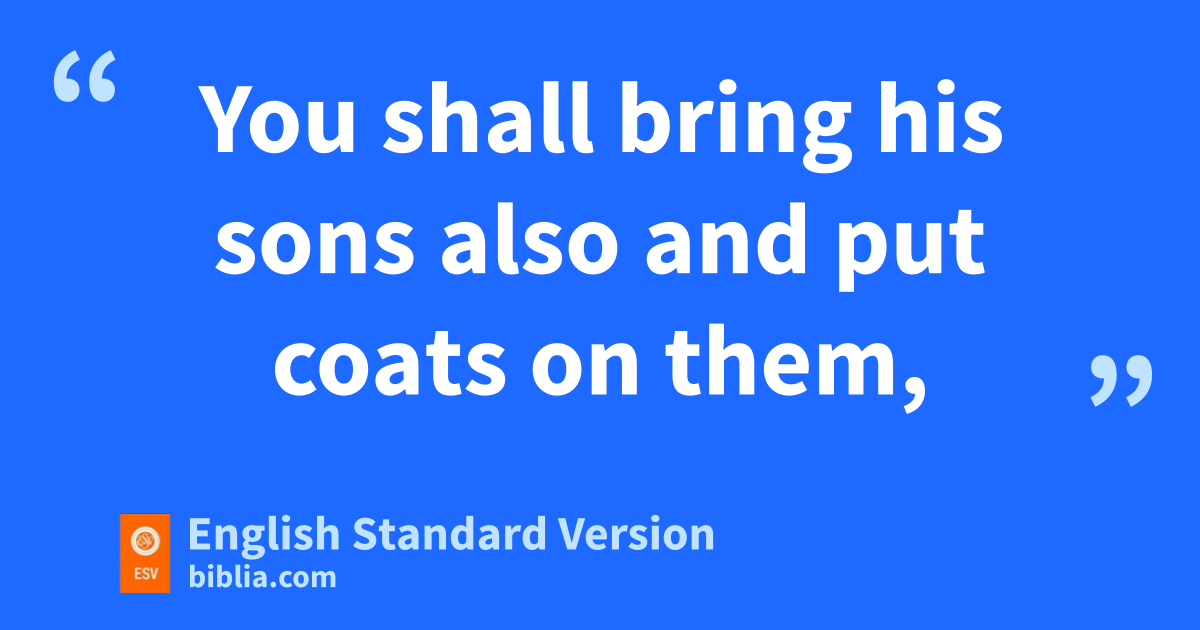 9 “Then you shall take the panointing oil and anoint the tabernacle and all that is in it, and consecrate it and all its furniture, so that it may become holy. 10 You shall also anoint qthe altar of burnt offering and all its utensils, and consecrate the altar, rso that the altar may become most holy. 11 You shall also anoint the basin and its stand, and consecrate it. 12 sThen you shall bring Aaron and his sons to the entrance of the tent of meeting and shall wash them with water 13 and put on Aaron the holy garments. And you shall anoint him and consecrate him, that he may serve me as priest. 14 You shall bring his sons also and put coats on them, 15 tand anoint them, as you anointed their father, that they may serve me as priests. And their anointing shall admit them to a uperpetual priesthood throughout their generations.”