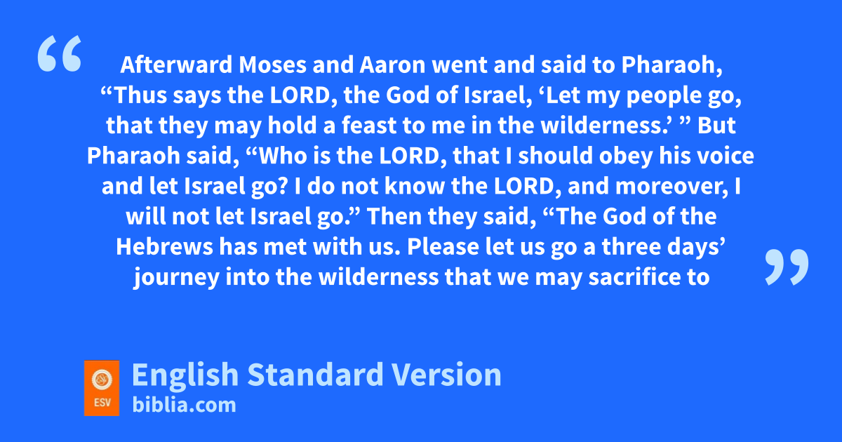 5 Afterward Moses and Aaron went and said to Pharaoh, “Thus says the Lord, the God of Israel, ‘Let my people go, that they may hold ta feast to me in the wilderness.’ ” 2 But Pharaoh said, u“Who is the Lord, that I should obey his voice and let Israel go? I do not know the Lord, and moreover, vI will not let Israel go.” 3 Then they said, “The wGod of the Hebrews has met with us. Please let us go a three days’ journey into the wilderness that we may sacrifice to the Lord our God, lest he fall upon us with pestilence or with the sword.” 4 But the king of Egypt said to them, “Moses and Aaron, why do you take the people away from their work? Get back to your xburdens.” 5 And Pharaoh said, “Behold, ythe people of the land are now many,1 and you make them rest from their burdens!” 6 The same day Pharaoh commanded the ztaskmasters of the people and their aforemen, 7 “You shall no longer give the people straw to make bricks, as in the past; let them go and gather straw for themselves. 8 But the number of bricks that they made in the past you shall impose on them, you shall by no means reduce it, for they are idle. Therefore they cry, ‘Let us go and offer sacrifice to our God.’ 9 Let heavier work be laid on the men that they may labor at it and pay no regard to lying words.”