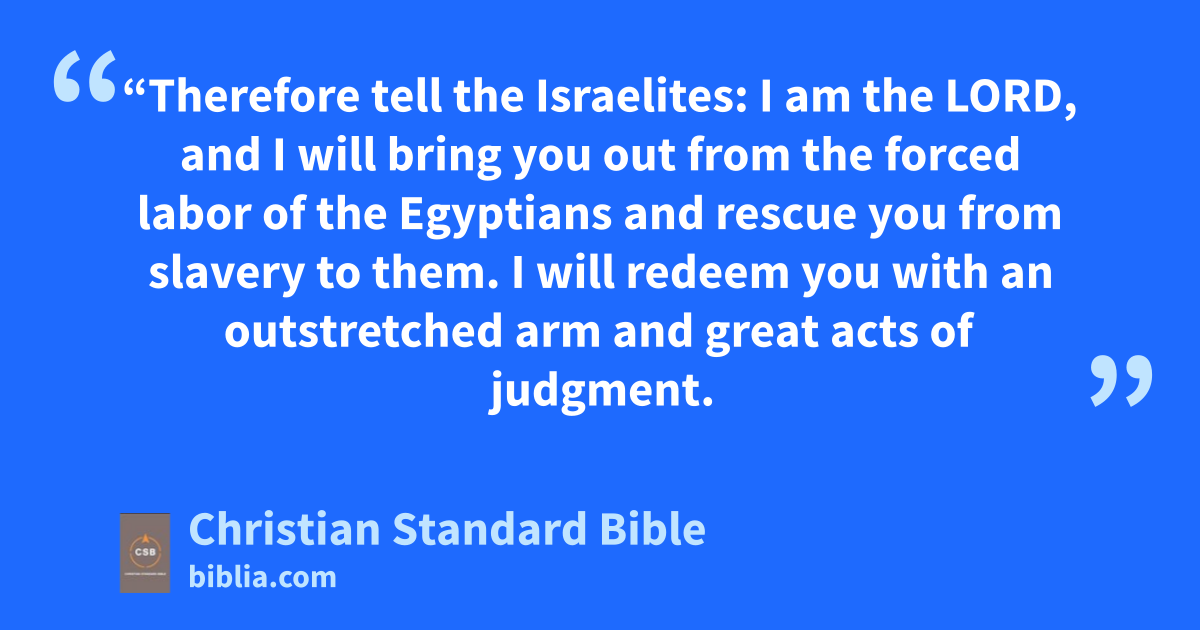 6 “Therefore tell the Israelites: I am the Lord, and I will bring you out from the forced labor of the Egyptians and rescue you from slavery to them. I will redeem you with an outstretched armd and great acts of judgment. 7 I will take you as my people,e and I will be your God. You will knowf that I am the Lord your God, who brought you out from the forced labor of the Egyptians. 8 I will bring you to the land that I sworeB,g to give to Abraham, Isaac, and Jacob, and I will give it to you as a possession. I am the Lord.” 9 Moses told this to the Israelites, but they did not listenh to him because of their broken spirit and hard labor.