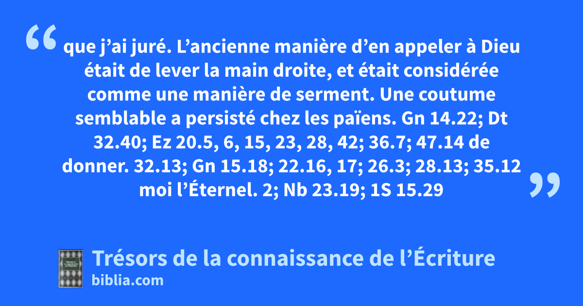 que j’ai juré. L’ancienne manière d’en appeler à Dieu était de lever la main droite, et était considérée comme une manière de serment. Une coutume semblable a persisté chez les païens. Gn 14.22; Dt 32.40; Ez 20.5, 6, 15, 23, 28, 42; 36.7; 47.14 de donner. 32.13; Gn 15.18; 22.16, 17; 26.3; 28.13; 35.12 moi l’Éternel. 2; Nb 23.19; 1S 15.29