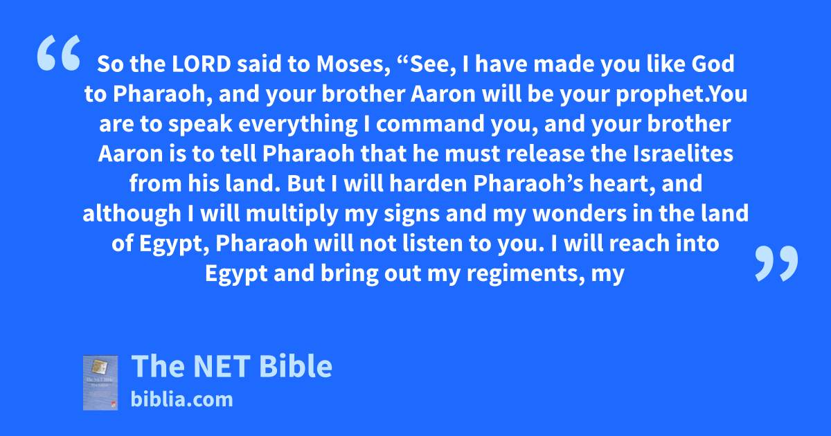 7:1 So the Lord said to Moses, “See, I have made you like God1 to Pharaoh, and your brother Aaron will be your prophet.2 7:2 You are to speak3 everything I command you,4 and your brother Aaron is to tell Pharaoh that he must release5 the Israelites from his land. 7:3 But I will harden6 Pharaoh’s heart, and although I will multiply7 my signs and my wonders in the land of Egypt, 7:4 Pharaoh will not listen to you.8 I will reach into9 Egypt and bring out my regiments,10 my people the Israelites, from the land of Egypt with great acts of judgment. 7:5 Then11 the Egyptians will know that I am the Lord, when I extend my hand12 over Egypt and bring the Israelites out from among them.