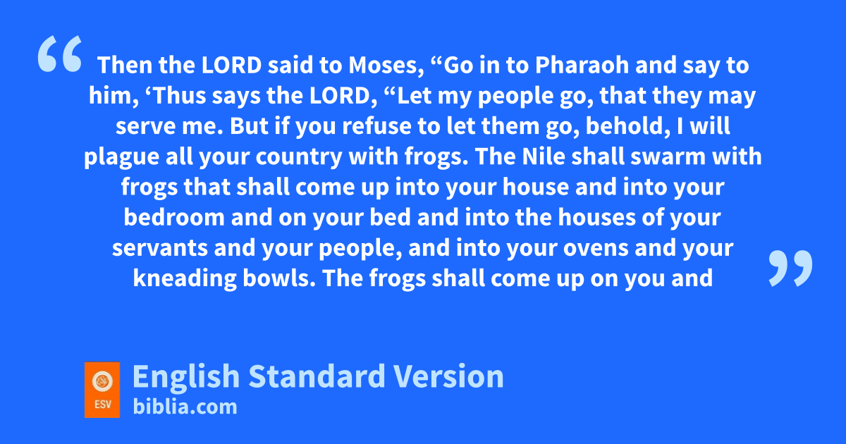 8 1 Then the Lord said to Moses, “Go in to Pharaoh and say to him, ‘Thus says the Lord, “Let my people go, that nthey may serve me. 2 But if you orefuse to let them go, behold, I will plague all your country with pfrogs. 3 The Nile shall swarm with frogs that shall come up into your house and into qyour bedroom and on your bed and into the houses of your servants and your people,2 and into your ovens and your kneading bowls. 4 The frogs shall come up on you and on your people and on all your servants.” ’ ” 5 3 And the Lord said to Moses, “Say to Aaron, r‘Stretch out your hand with your staff over the rivers, over the canals and over the pools, and make frogs come up on the land of Egypt!’ ” 6 So Aaron stretched out his hand over the waters of Egypt, and sthe frogs came up and covered the land of Egypt. 7 But tthe magicians did the same by their secret arts and made frogs come up on the land of Egypt.