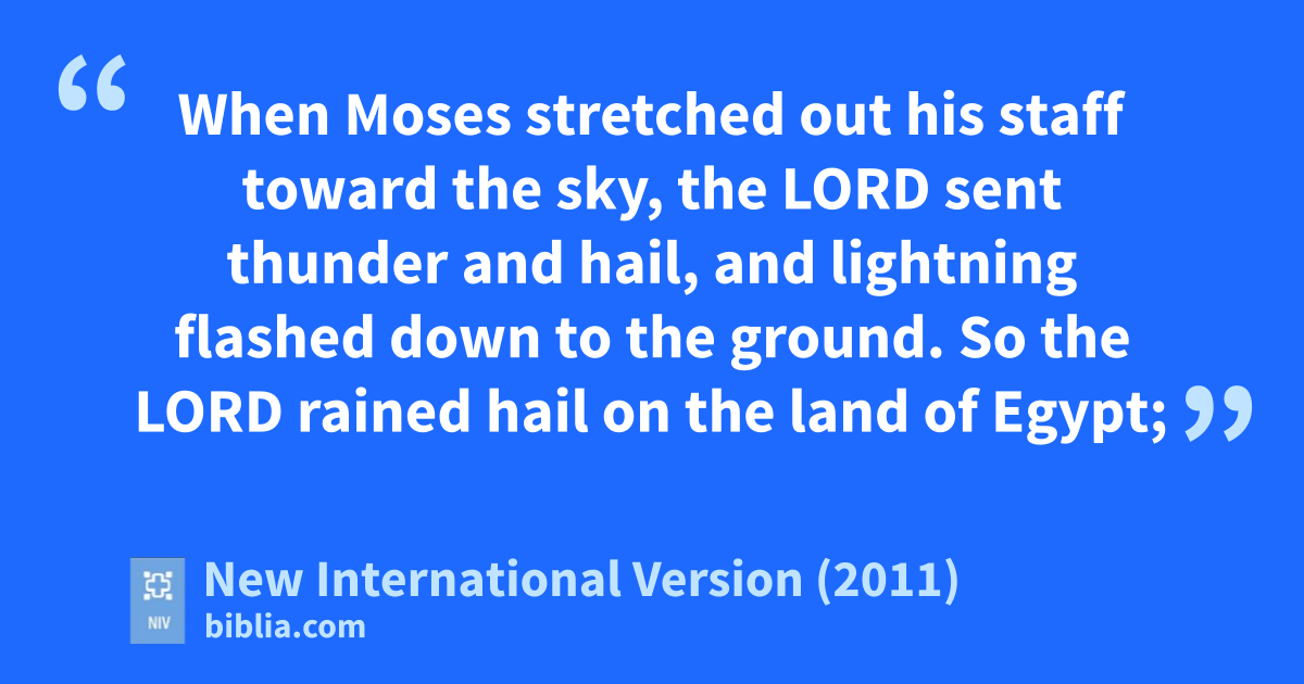 22 Then the Lord said to Moses, “Stretch out your hand toward the sky so that hail will fall all over Egypt—on people and animals and on everything growing in the fields of Egypt.” 23 When Moses stretched out his staff toward the sky, the Lord sent thunderc and hail,d and lightning flashed down to the ground. So the Lord rained hail on the land of Egypt; 24 hail fell and lightning flashed back and forth. It was the worst storm in all the land of Egypt since it had become a nation.e 25 Throughout Egypt hail struck everything in the fields—both people and animals; it beat down everything growing in the fields and stripped every tree.f 26 The only place it did not hail was the land of Goshen,g where the Israelites were.h