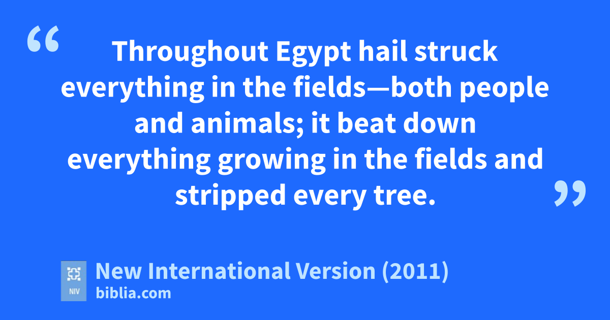 22 Then the Lord said to Moses, “Stretch out your hand toward the sky so that hail will fall all over Egypt—on people and animals and on everything growing in the fields of Egypt.” 23 When Moses stretched out his staff toward the sky, the Lord sent thunderc and hail,d and lightning flashed down to the ground. So the Lord rained hail on the land of Egypt; 24 hail fell and lightning flashed back and forth. It was the worst storm in all the land of Egypt since it had become a nation.e 25 Throughout Egypt hail struck everything in the fields—both people and animals; it beat down everything growing in the fields and stripped every tree.f 26 The only place it did not hail was the land of Goshen,g where the Israelites were.h