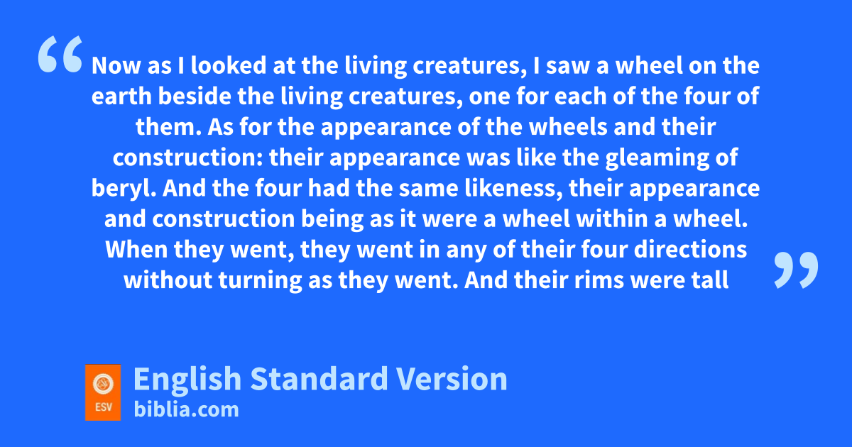 15 aNow as I looked at the living creatures, I saw a wheel on the earth beside the living creatures, one for each of the four of them.4 16 aAs for the appearance of the wheels and their construction: their appearance was like bthe gleaming of beryl. cAnd the four had the same likeness, their appearance and construction being as it were a wheel within a wheel. 17 dWhen they went, they went ein any of their four directions5 fwithout turning as they went. 18 And their rims were tall and awesome, gand the rims of all four were full of eyes all around. 19 hAnd when the living creatures went, the wheels went beside them; iand when the living creatures rose from the earth, the wheels rose. 20 jWherever the spirit wanted to go, they went, and the wheels rose along with them, jfor the spirit of the living creatures6 was in the wheels. 21 hWhen those went, these went; and when those stood, these stood; iand when those rose from the earth, the wheels rose along with them, jfor the spirit of the living creatures was in the wheels.