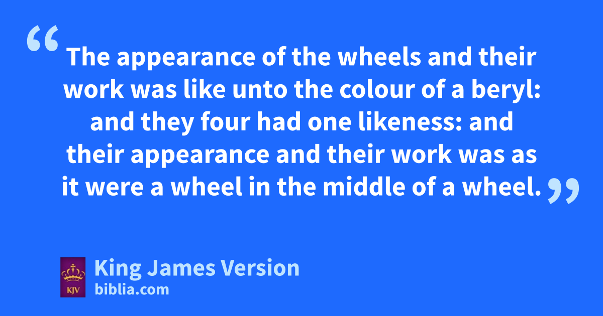 15 eNow as I beheld the living creatures, behold one wheel upon the earth by the living creatures, with his four faces. 16 eThe appearance of the wheels and their work was elike unto the colour of fa beryl: gand they four had one likeness: and their appearance and their work was gas it were a wheel in the middle of a wheel. 17 hWhen they went, they went upon their four isides: and jthey turned not when they went. 18 As for their rings, they were so high that they were dreadful; and their ||rings were kfull of ceyes round about them four. 19 lAnd when the living creatures went, the wheels went by them: and mwhen the living creatures were lifted up from the earth, the wheels were lifted up. 20 nWhithersoever the spirit was to go, they went, thither was their spirit to go; and mthe wheels were lifted up over against them: mfor the spirit ||of the living creature was in the wheels. 21 oWhen those went, these went; and oowhen those stood, these stood; and mwhen those were lifted up from the earth, the wheels were lifted up pover against them: mfor the spirit ||of the living creature was in the wheels. 22 And the likeness of ppthe firmament upon the heads of the living creature was as the colour of the terrible qcrystal, stretched forth over their heads above. 23 And under the firmament were their wings rstraight, the one toward the other: every one had two, swhich covered on this side, and every one had two, which covered on that side, their bodies. 24 And when they went, tI heard the noise of their wings, ulike the noise of great waters, as tvthe voice of wthe Almighty, the voice of xspeech, yas the noise of an host: when they stood, they let down their wings. 25 And there was a voice from pthe firmament that was over their heads, when they stood, and had let down their wings.