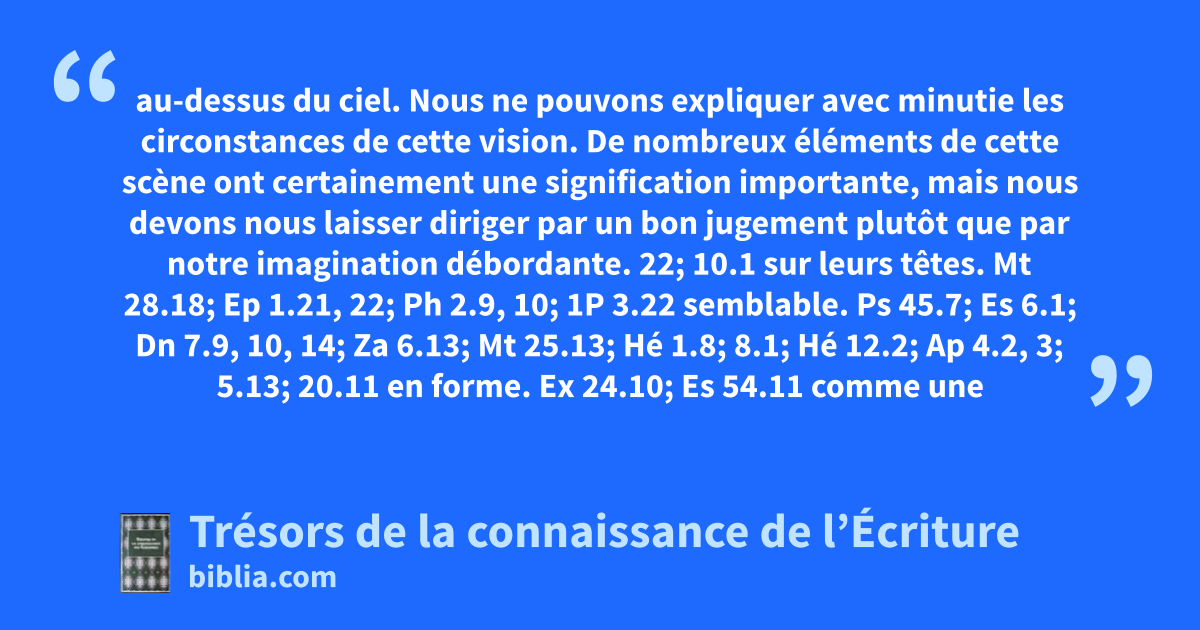 au-dessus du ciel. Nous ne pouvons expliquer avec minutie les circonstances de cette vision. De nombreux éléments de cette scène ont certainement une signification importante, mais nous devons nous laisser diriger par un bon jugement plutôt que par notre imagination débordante. 22; 10.1 sur leurs têtes. Mt 28.18; Ep 1.21, 22; Ph 2.9, 10; 1P 3.22 semblable. Ps 45.7; Es 6.1; Dn 7.9, 10, 14; Za 6.13; Mt 25.13; Hé 1.8; 8.1; Hé 12.2; Ap 4.2, 3; 5.13; 20.11 en forme. Ex 24.10; Es 54.11 comme une figure d’homme. Gn 32.24-30; Jos 5.13-15; 6.1, 2; Es 9.5, 6; Jr 23.5, 6; Dn 10.18; Ap 1.13; 3.21; 14.14