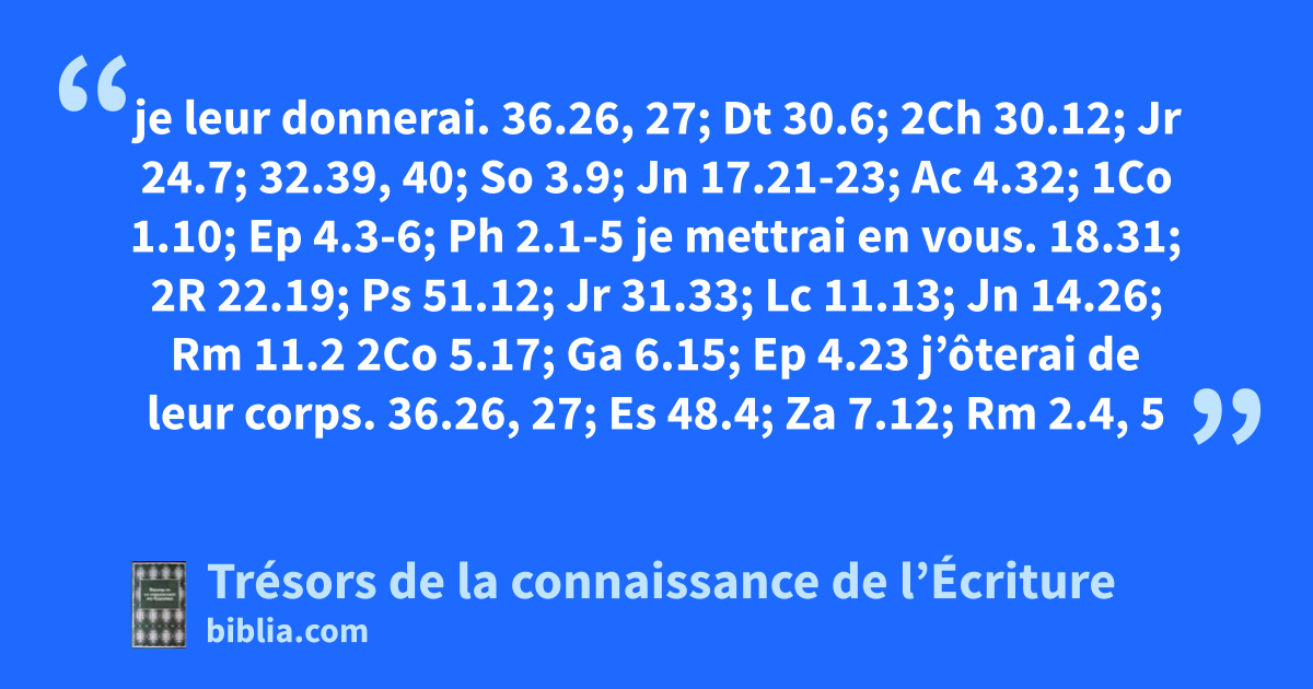 je leur donnerai. 36.26, 27; Dt 30.6; 2Ch 30.12; Jr 24.7; 32.39, 40; So 3.9; Jn 17.21-23; Ac 4.32; 1Co 1.10; Ep 4.3-6; Ph 2.1-5 je mettrai en vous. 18.31; 2R 22.19; Ps 51.12; Jr 31.33; Lc 11.13; Jn 14.26; Rm 11.2 2Co 5.17; Ga 6.15; Ep 4.23 j’ôterai de leur corps. 36.26, 27; Es 48.4; Za 7.12; Rm 2.4, 5