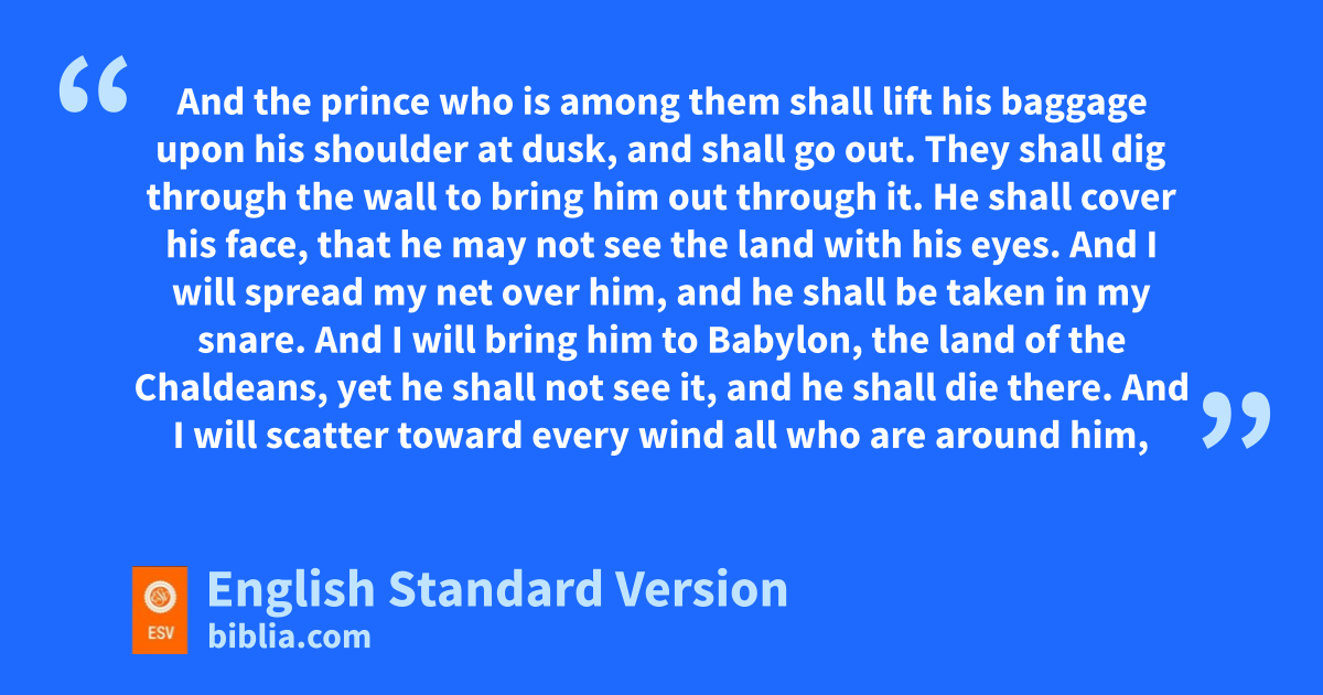 8 In the morning the word of the Lord came to me: 9 u“Son of man, has not the house of Israel, vthe rebellious house, said to you, w‘What are you doing?’ 10 Say to them, ‘Thus says the Lord God: This oracle concerns2 xthe prince in Jerusalem and all the house of Israel who are in it.’3 11 Say, y‘I am a sign for you: zas I have done, so shall it be done to them. They shall go into exile, into captivity.’ 12 aAnd the prince who is among them shall lift his baggage upon his shoulder at dusk, and shall go out. bThey shall dig through the wall to bring him out through it. cHe shall cover his face, that he may not see the land with his eyes. 13 dAnd I will spread my net over him, and he shall be taken in my snare. And eI will bring him to Babylon, the land of the Chaldeans, eyet he shall not see it, and he shall die there. 14 fAnd I will scatter toward every wind all who are around him, his helpers and all his troops, gand I will unsheathe the sword after them. 15 hAnd they shall know that I am the Lord, when I disperse them among the nations and scatter them among the countries. 16 iBut I will let a few of them escape from the sword, from famine and pestilence, that they may declare all their abominations among the nations where they go, jand may know that I am the Lord.”