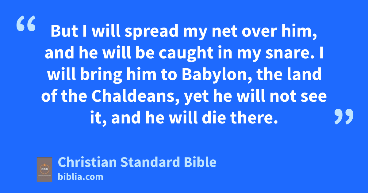 8 In the morning the word of the Lord came to me: 9 “Son of man, hasn’t the house of Israel, that rebellious house,i asked you, ‘What are you doing?’j 10 Say to them, ‘This is what the Lord God says: This pronouncement concerns the princeA in Jerusalem and the whole house of Israel living there.’B 11 You are to say, ‘I am a sign for you. Just as I have done, it will be done to them; they will go into exile,k into captivity.’ 12 The prince who is amongl them will lift his bags to his shoulder in the dark and go out. TheyC will dig through the wall to bring him out through it. He will cover his face so he cannot see the land with his eyes. 13 But I will spread my net over him, and he will be caught in my snare. I will bring him to Babylon, the land of the Chaldeans, yet he will not see it,m and he will die there. 14 I will also scatter all the attendants who surround him and all his troops to every direction of the wind,n and I will draw a sword to chase after them. 15 They will know that I am the Lordo when I disperse them among the nations and scatter them among the countries.p 16 But I will spare a few of them from the sword,q famine, and plague, so that among the nations where they go they can tell about all their detestable practices. Then they will know that I am the Lord.”