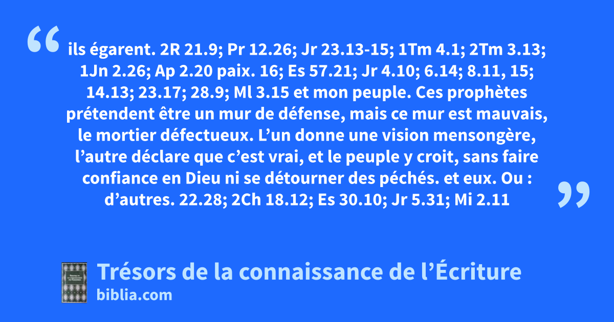 ils égarent. 2R 21.9; Pr 12.26; Jr 23.13-15; 1Tm 4.1; 2Tm 3.13; 1Jn 2.26; Ap 2.20 paix. 16; Es 57.21; Jr 4.10; 6.14; 8.11, 15; 14.13; 23.17; 28.9; Ml 3.15 et mon peuple. Ces prophètes prétendent être un mur de défense, mais ce mur est mauvais, le mortier défectueux. L’un donne une vision mensongère, l’autre déclare que c’est vrai, et le peuple y croit, sans faire confiance en Dieu ni se détourner des péchés. et eux. Ou : d’autres. 22.28; 2Ch 18.12; Es 30.10; Jr 5.31; Mi 2.11