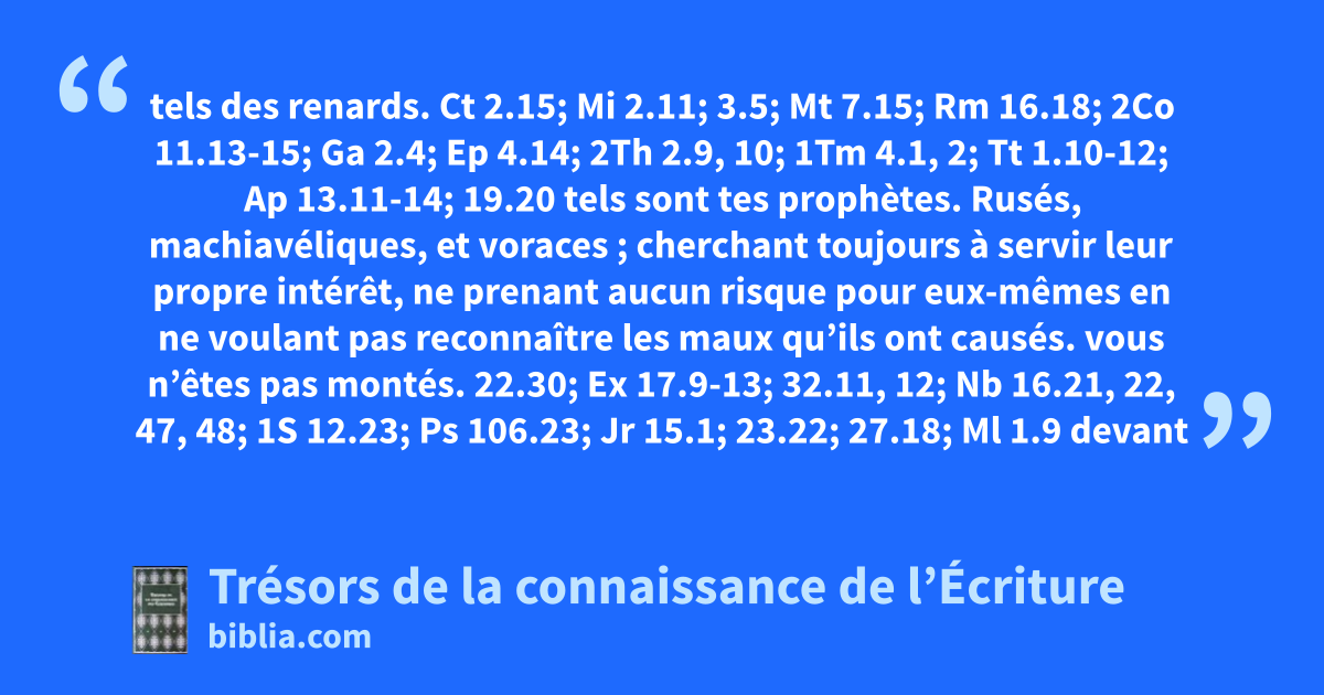 tels des renards. Ct 2.15; Mi 2.11; 3.5; Mt 7.15; Rm 16.18; 2Co 11.13-15; Ga 2.4; Ep 4.14; 2Th 2.9, 10; 1Tm 4.1, 2; Tt 1.10-12; Ap 13.11-14; 19.20 tels sont tes prophètes. Rusés, machiavéliques, et voraces ; cherchant toujours à servir leur propre intérêt, ne prenant aucun risque pour eux-mêmes en ne voulant pas reconnaître les maux qu’ils ont causés.