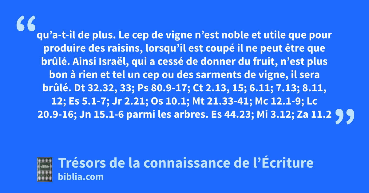 qu’a-t-il de plus. Le cep de vigne n’est noble et utile que pour produire des raisins, lorsqu’il est coupé il ne peut être que brûlé. Ainsi Israël, qui a cessé de donner du fruit, n’est plus bon à rien et tel un cep ou des sarments de vigne, il sera brûlé. Dt 32.32, 33; Ps 80.9-17; Ct 2.13, 15; 6.11; 7.13; 8.11, 12; Es 5.1-7; Jr 2.21; Os 10.1; Mt 21.33-41; Mc 12.1-9; Lc 20.9-16; Jn 15.1-6 parmi les arbres. Es 44.23; Mi 3.12; Za 11.2