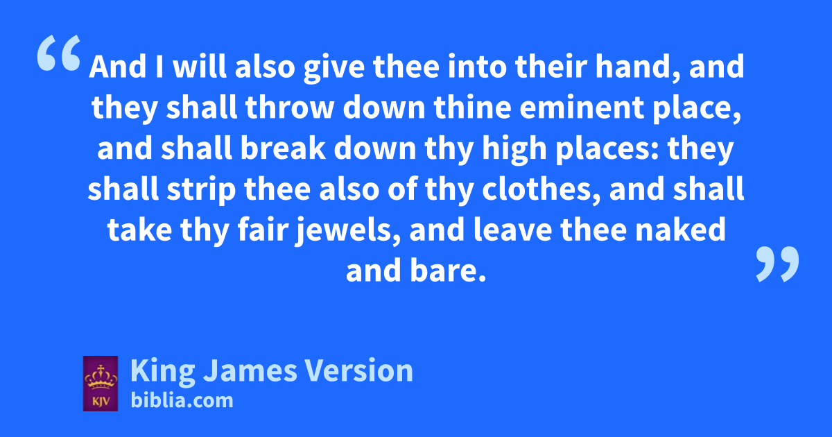 35 Wherefore, O harlot, hear the word of the Lord: 36 Thus saith the Lord God; Because thy qfilthiness was poured out, and thy nakedness discovered through thy whoredoms with thy lovers, and with all the idols of thy abominations, and by rthe blood of thy children, rwhich thou didst give unto them; 37 Behold, therefore sI will gather all thy lovers, with whom thou hast taken pleasure, and all them that thou hast loved, twith all them that thou hast hated; sI will even gather them round about against thee, and ttwill discover thy nakedness unto them, that uthey may see all thy nakedness. 38 And uuI will judge thee, †as vwwomen that break wedlock and rvxshed blood are judged; and I will give thee blood in fury and jealousy. 39 And I will also give thee into their hand, and they shall throw down ythine eminent place, and shall break down ythy high places: uzathey shall strip thee also of thy clothes, zand bshall take †thy fair jewels, and leave thee cnaked and bare. 40 dThey shall also bring up a company against thee, and ethey shall stone thee with stones, and thrust thee through with their swords. 41 And fthey shall burn thine houses with fire, and gexecute judgments upon thee in the sight of many women: and hI will cause thee to cease from playing the harlot, and ithou also shalt give no hire any more. 42 So kwill I make my fury toward thee to rest, and my jealousy shall depart from thee, and I will be quiet, and will be no more angry. 43 Because thou hast not remembered lthe days of thy youth, but mhast fretted me in all these things; behold, therefore nI also will recompense thy way upon thine head, saith the Lord God: and thou shalt not nncommit this lewdness above all thine abominations.
