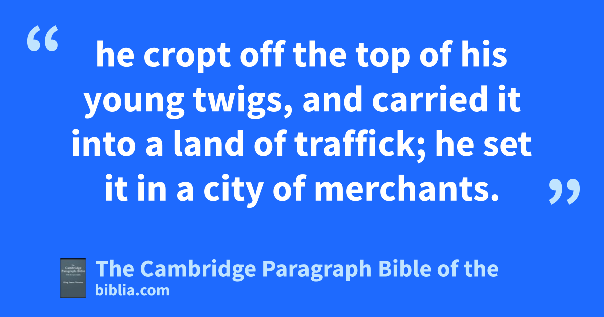 XVII. * And the word of the Lord came unto me, saying, 2 Son of man, aput forth a riddle, and bspeak a parable unto the house of Israel; 3 and say, Thus saith the Lord God; cA great eagle dwith great wings, dlongwinged, full of dfeathers, which had * divers colours, ecame unto Lebanon, and ftook gthe highest branch of the cedar: 4 fhe cropt off the top of his young twigs, and carried it into a land of htraffick; he set it in a city of merchants. 5 iHe took also of the seed of the land, and * planted it jin a fruitful field; he placed it kby great waters, and set it kas a willow tree. 6 And it grew, and became kka spreading vine lof low stature, mwhose branches turned toward him, and the roots thereof were under him: so it became a vine, and brought forth nbranches, and shot forth osprigs. 7 There was also panother great eagle dwith great wings and many dfeathers: and behold, pthis vine mdid bend her roots toward him, and shot forth her branches toward him, that he might water it by qthe furrows of her plantation. 8 It was planted in a good * soil by great waters, qqthat it might bring forth branches, and qqthat it might bear fruit, qqthat it might be a goodly vine. 9 Say thou, Thus saith the Lord God; Shall it prosper? shall he not pull up the roots thereof, and cut off the fruit thereof, that it wither? it shall wither in all the leaves of her spring, even without great power or many people to pluck it up by the roots thereof. 10 Yea behold, being planted, shall it prosper? rshall it not utterly wither, when sthe east wind toucheth it? it shall wither in qthe furrows where it grew.