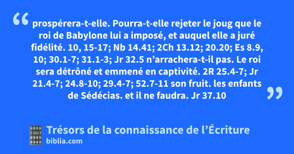 prospérera-t-elle. Pourra-t-elle rejeter le joug que le roi de Babylone lui a imposé, et auquel elle a juré fidélité. 10, 15-17; Nb 14.41; 2Ch 13.12; 20.20; Es 8.9, 10; 30.1-7; 31.1-3; Jr 32.5 n’arrachera-t-il pas. Le roi sera détrôné et emmené en captivité. 2R 25.4-7; Jr 21.4-7; 24.8-10; 29.4-7; 52.7-11 son fruit. les enfants de Sédécias. et il ne faudra. Jr 37.10