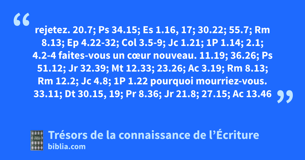 rejetez. 20.7; Ps 34.15; Es 1.16, 17; 30.22; 55.7; Rm 8.13; Ep 4.22-32; Col 3.5-9; Jc 1.21; 1P 1.14; 2.1; 4.2-4 faites-vous un cœur nouveau. 11.19; 36.26; Ps 51.12; Jr 32.39; Mt 12.33; 23.26; Ac 3.19; Rm 8.13; Rm 12.2; Jc 4.8; 1P 1.22 pourquoi mourriez-vous. 33.11; Dt 30.15, 19; Pr 8.36; Jr 21.8; 27.15; Ac 13.46