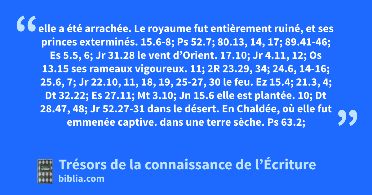 elle a été arrachée. Le royaume fut entièrement ruiné, et ses princes exterminés. 15.6-8; Ps 52.7; 80.13, 14, 17; 89.41-46; Es 5.5, 6; Jr 31.28 le vent d’Orient. 17.10; Jr 4.11, 12; Os 13.15 ses rameaux vigoureux. 11; 2R 23.29, 34; 24.6, 14-16; 25.6, 7; Jr 22.10, 11, 18, 19, 25-27, 30 le feu. Ez 15.4; 21.3, 4; Dt 32.22; Es 27.11; Mt 3.10; Jn 15.6