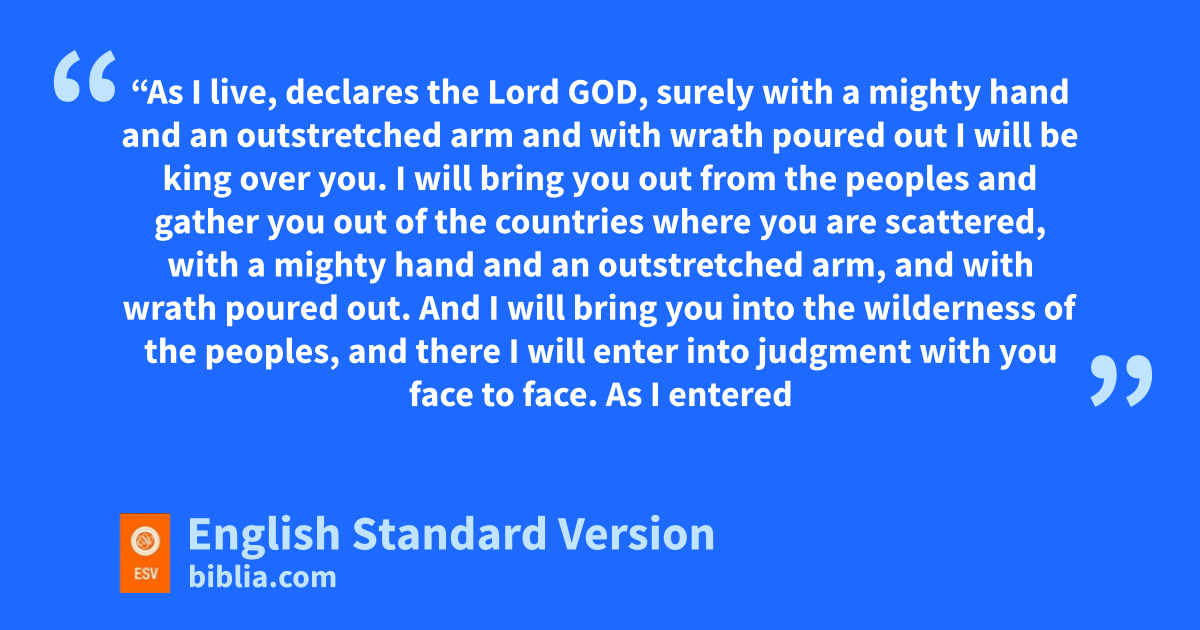 33 i“As I live, declares the Lord God, msurely with a mighty hand and an outstretched arm and nwith wrath poured out I will be king over you. 34 oI will bring you out from the peoples and gather you out of the countries where you are scattered, with a mighty hand and an outstretched arm, and with wrath poured out. 35 pAnd I will bring you into the wilderness of the peoples, qand there I will enter into judgment with you rface to face. 36 sAs I entered into judgment with your fathers in the wilderness of the land of Egypt, so I will enter into judgment with you, declares the Lord God. 37 I will make you tpass under the rod, and I will bring you into the bond of the covenant. 38 uI will purge out the rebels from among you, and those who transgress against me. vI will bring them out of the land where they sojourn, wbut they shall not enter the land of Israel. xThen you will know that I am the Lord.