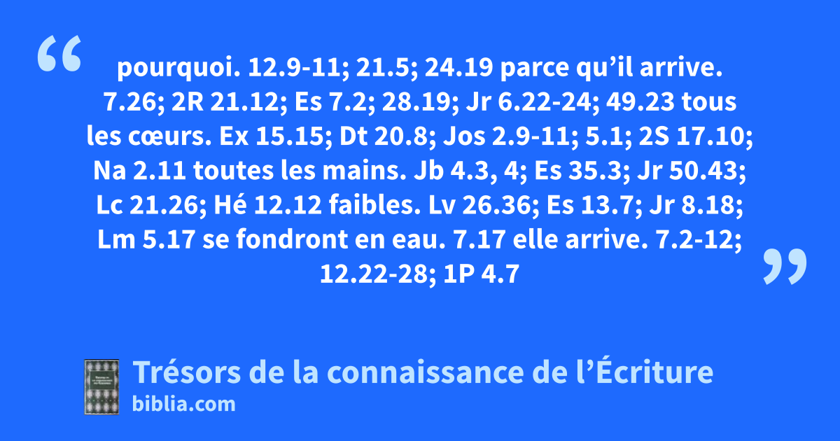 pourquoi. 12.9-11; 21.5; 24.19 parce qu’il arrive. 7.26; 2R 21.12; Es 7.2; 28.19; Jr 6.22-24; 49.23 tous les cœurs. Ex 15.15; Dt 20.8; Jos 2.9-11; 5.1; 2S 17.10; Na 2.11 toutes les mains. Jb 4.3, 4; Es 35.3; Jr 50.43; Lc 21.26; Hé 12.12 faibles. Lv 26.36; Es 13.7; Jr 8.18; Lm 5.17 se fondront en eau. 7.17 elle arrive. 7.2-12; 12.22-28; 1P 4.7