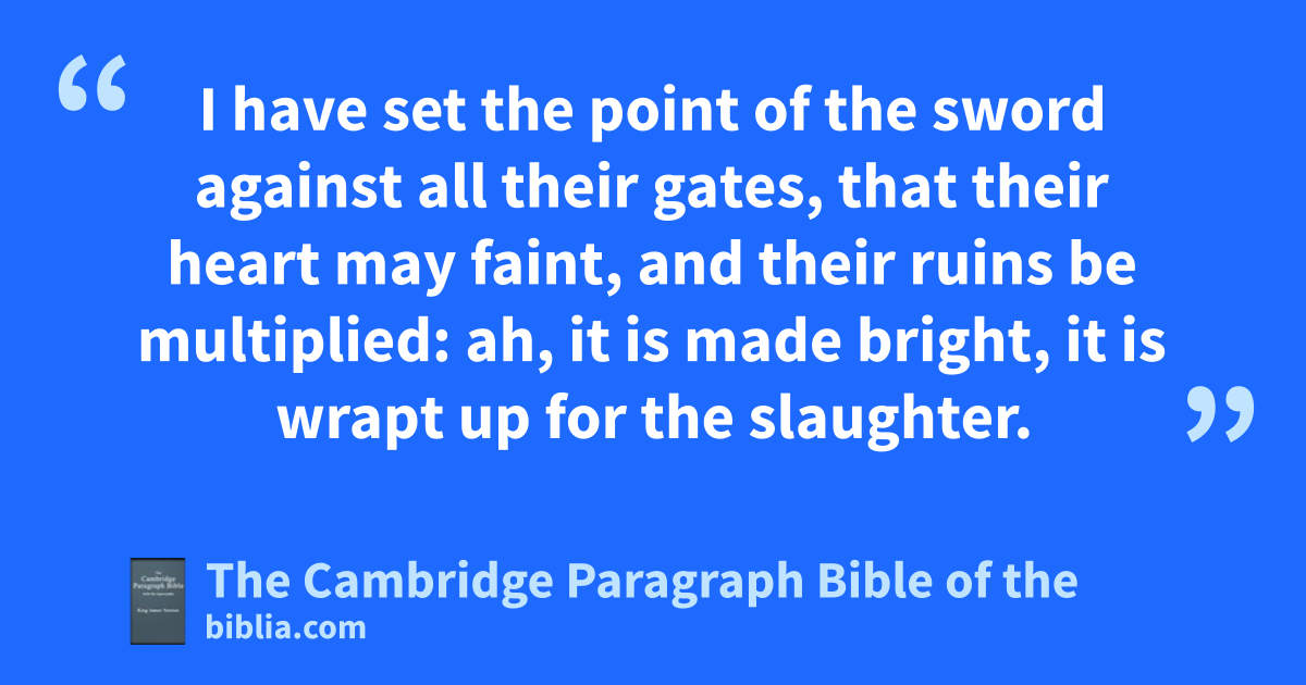 8 Again the word of the Lord came unto me, saying, 9 Son of man, prophesy, and say, Thus saith the Lord; Say, iA sword, a sword jis sharpened, and also kfurbished: 10 jit is sharpened to make a sore slaughter; kit is furbished that it may ilglitter: should mwe then make mirth? * it contemneth nthe rod of nomy son, as every tree. 11 And he hath given it kto be furbished, that it may be handled: jthis sword is sharpened, and kit is furbished, to give it into the hand of pthe slayer. 12 Cry and howl, son of man: for it shall be upon my people, it shall be upon all the princes of Israel: * terrors by reason of the sword shall be upon my people: qsmite therefore upon thy thigh. 13 * Because it is a trial, and rwhat if the sword contemn even the rod? it sshall be no more, saith the Lord God. 14 Thou therefore, son of man, prophesy, and qtsmite thine * hands together, and let the sword be doubled uthe third time, the sword of the slain: it is the sword of the great men that are slain, vwhich entereth into their privy chambers. 15 I have set the * point of the sword against all their gates, that their heart may faint, and their wruins be multiplied: ah, it is made lbright, it is * wrapt up for the slaughter. 16 xGo thee one way or other, either on the right hand, * or on the left, ywhithersoever thy face is set. 17 I will also qtsmite mine hands together, and zI will cause my fury to rest: zzI the Lord have said it.
