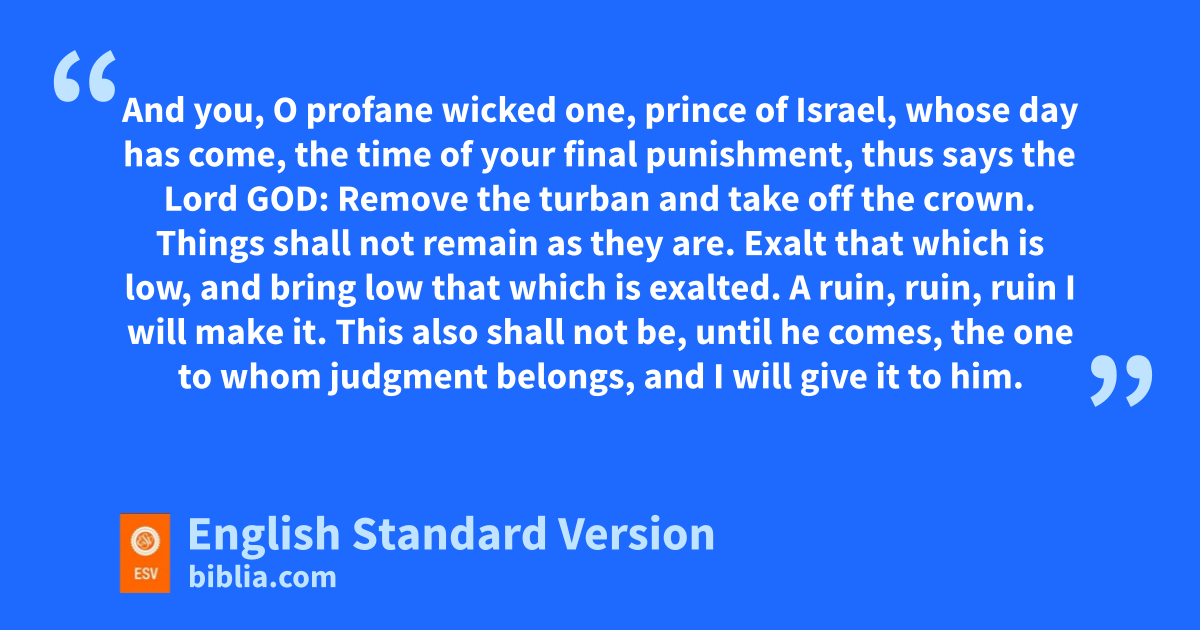 24 “Therefore thus says the Lord God: Because you have made your guilt to be remembered, in that your transgressions are uncovered, so that in all your deeds your sins appear—because you have come to remembrance, fyou shall be taken in hand. 25 And you, O profane9 gwicked one, prince of Israel, hwhose day has come, ithe time of your final punishment, 26 thus says the Lord God: Remove the turban and take off the crown. Things shall not remain as they are. jExalt that which is low, and bring low that which is exalted. 27 A ruin, ruin, ruin I will make it. kThis also shall not be, luntil he comes, the one to whom judgment belongs, and I will give it to him.