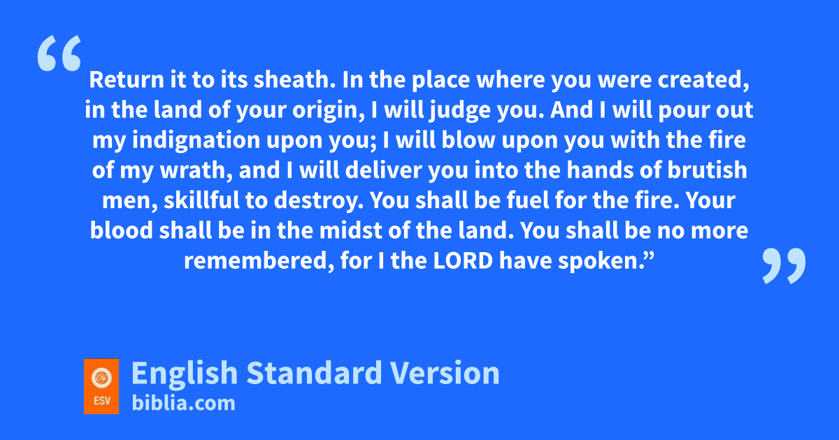 28 “And you, mson of man, prophesy, and say, Thus says the Lord God nconcerning the Ammonites and concerning their reproach; say, oA sword, a sword pis drawn for the slaughter. oIt is polished to consume and to flash like lightning— 29 while qthey see for you false visions, while they divine lies for you—to place you on the necks of the profane wicked, rwhose day has come, the time of their final punishment. 30 pReturn it to its sheath. In the place where you were created, in the land of your origin, sI will judge you. 31 And tI will pour out my indignation upon you; uI will blow upon you with the fire of my wrath, and I will deliver you into the hands of vbrutish men, skillful to destroy. 32 You shall be fuel for the fire. Your blood shall be in the midst of the land. wYou shall be no more remembered, xfor I the Lord have spoken.”