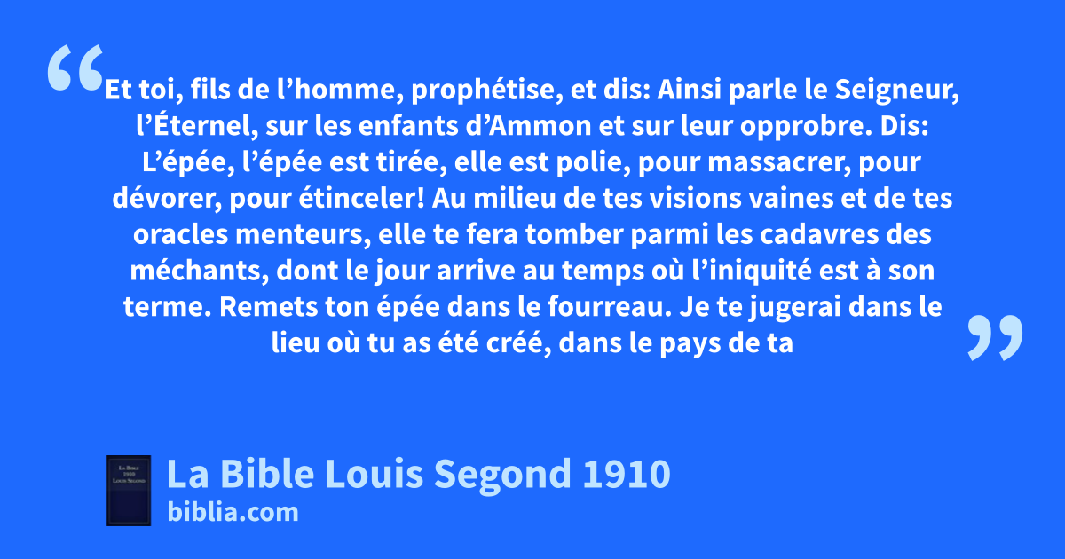 33Et toi, fils de l’homme, prophétise, et dis: Ainsi parle le Seigneur, l’Éternel, sur les enfants d’Ammon et sur leur opprobre. Dis: L’épée, l’épée est tirée, elle est polie, pour massacrer, pour dévorer, pour étinceler! 34Au milieu de tes visions vaines et de tes oracles menteurs, elle te fera tomber parmi les cadavres des méchants, dont le jour arrive au temps où l’iniquité est à son terme. 35Remets ton épée dans le fourreau. Je te jugerai dans le lieu où tu as été créé, dans le pays de ta naissance. 36Je répandrai sur toi ma colère, je soufflerai contre toi avec le feu de ma fureur, et je te livrerai entre les mains d’hommes qui dévorent, qui ne travaillent qu’à détruire. 37Tu seras consumé par le feu; ton sang coulera au milieu du pays; on ne se souviendra plus de toi. Car moi, l’Éternel, j’ai parlé.