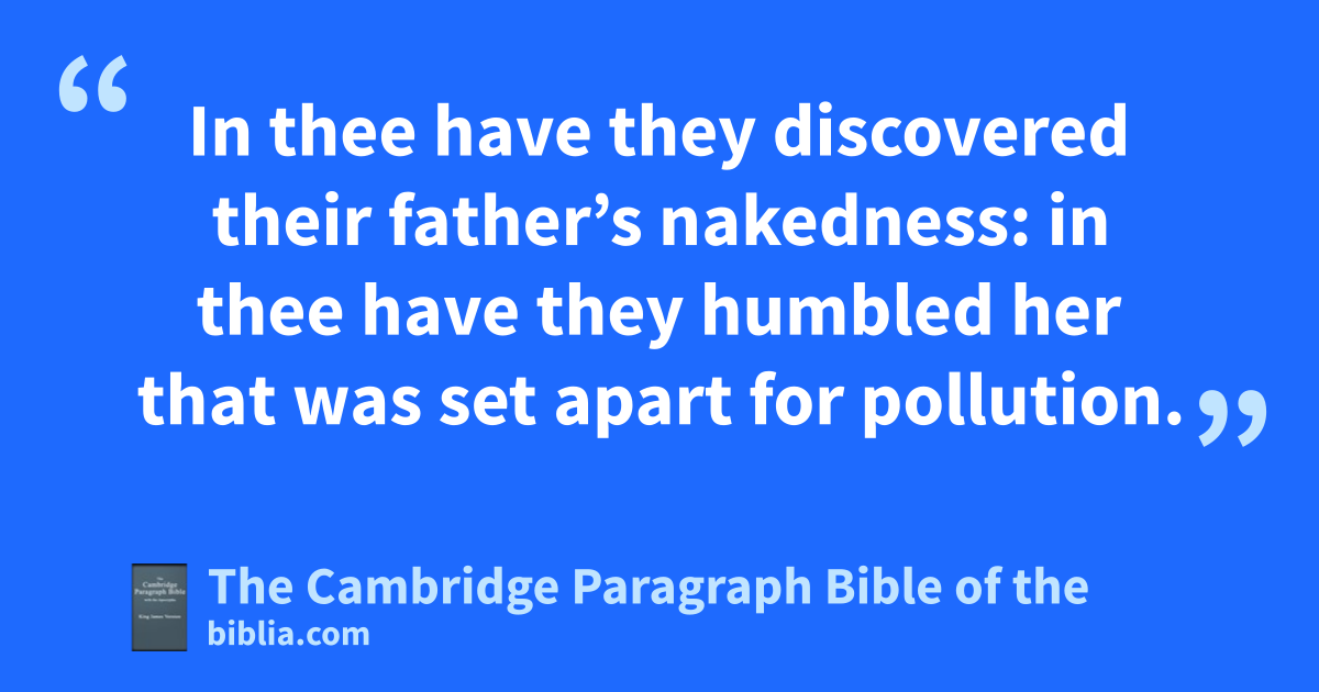 XXII. Moreover the word of the Lord came unto me, saying, 2 Now, thou son of man, awilt thou * judge, wilt thou judge the * bbloody city? yea, thou shalt * bbshew her all her abominations. 3 Then say thou, Thus saith the Lord God, cThe city sheddeth blood in the midst of it, that dher time may come, and maketh idols against herself eto defile herself. 4 fThou art become guilty cin thy blood that thou hast shed; and hast defiled thyself in thine idols which thou hast made; and dthou hast caused thy days to draw near, and gart come even unto thy years: therefore have I made thee ha reproach unto the heathen, and ia mocking to all countries. 5 Those that be near, and those that be far from thee, shall mock thee, which art * infamous and much vexed. 6 Behold, lthe princes of Israel, every one were in thee to their * mpower cto shed blood. 7 In thee nhave they set light by father and mother: in the midst of thee have they odealt by * poppression with the stranger: in thee pphave they qvexed the fatherless and the widow. 8 rThou hast despised mine holy things, and shast profaned my sabbaths. 9 In thee are * tmen that carry tales cto shed blood: and in thee uthey eat upon the mountains: in the midst of thee vthey commit lewdness. 10 In thee whave they discovered their father’s nakedness: in thee have they humbled xher that was jset apart for pollution. 11 And * one yhath committed abomination with his neighbour’s wife; and * another zhath * lewdly defiled his daughter in law; and * another in thee ahath humbled his sister, his father’s daughter. 12 In thee bhave they taken gifts bbto shed blood; cthou hast taken usury and increase, and thou hast greedily gained of thy neighbours by dextortion, and ehast forgotten me, saith the Lord God. 13 Behold therefore, fI have smitten mine hand at gthy dishonest gain which thou hast made, and at bbthy blood which hath been in the midst of thee. 14 hCan thine heart endure, or can thine hands be strong, in the days that I shall deal with thee? iI the Lord have spoken it, and will do it. 15 And klI will scatter thee among the heathen, and kmdisperse thee in the countries, and nwill consume thy filthiness out of thee. 16 And thou * shalt otake thine inheritance in thyself in the sight of the heathen, pand thou shalt know that I am the Lord.