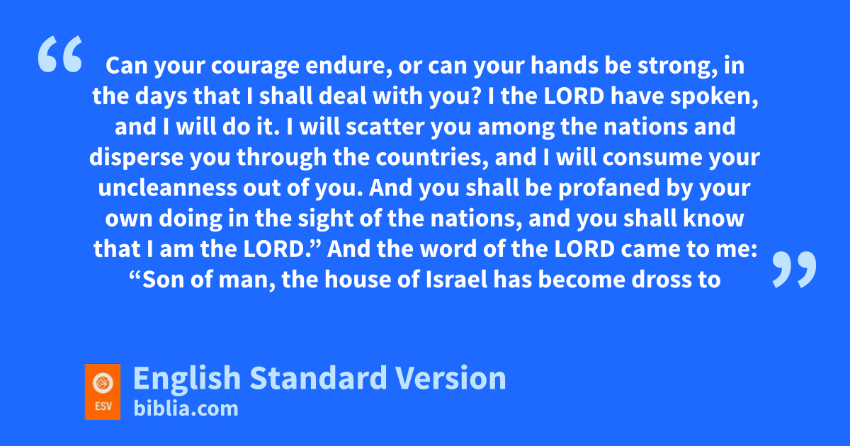 17 And the word of the Lord came to me: 18 f“Son of man, the house of Israel has become gdross to me; all of them are hbronze and tin and iron and lead in the furnace; they are idross of silver. 19 Therefore thus says the Lord God: Because you have all become dross, therefore, behold, I will gather you into the midst of Jerusalem. 20 As one gathers silver and bronze and iron and lead and tin into a furnace, jto blow the fire on it in order to melt it, so I will gather you kin my anger and in my wrath, and I will put you in and melt you. 21 I will gather you and blow on you with the fire of my wrath, and you shall be melted in the midst of it. 22 As silver is melted in a furnace, so you shall be melted in the midst of it, and you shall know that I am the Lord; lI have poured out my wrath upon you.”