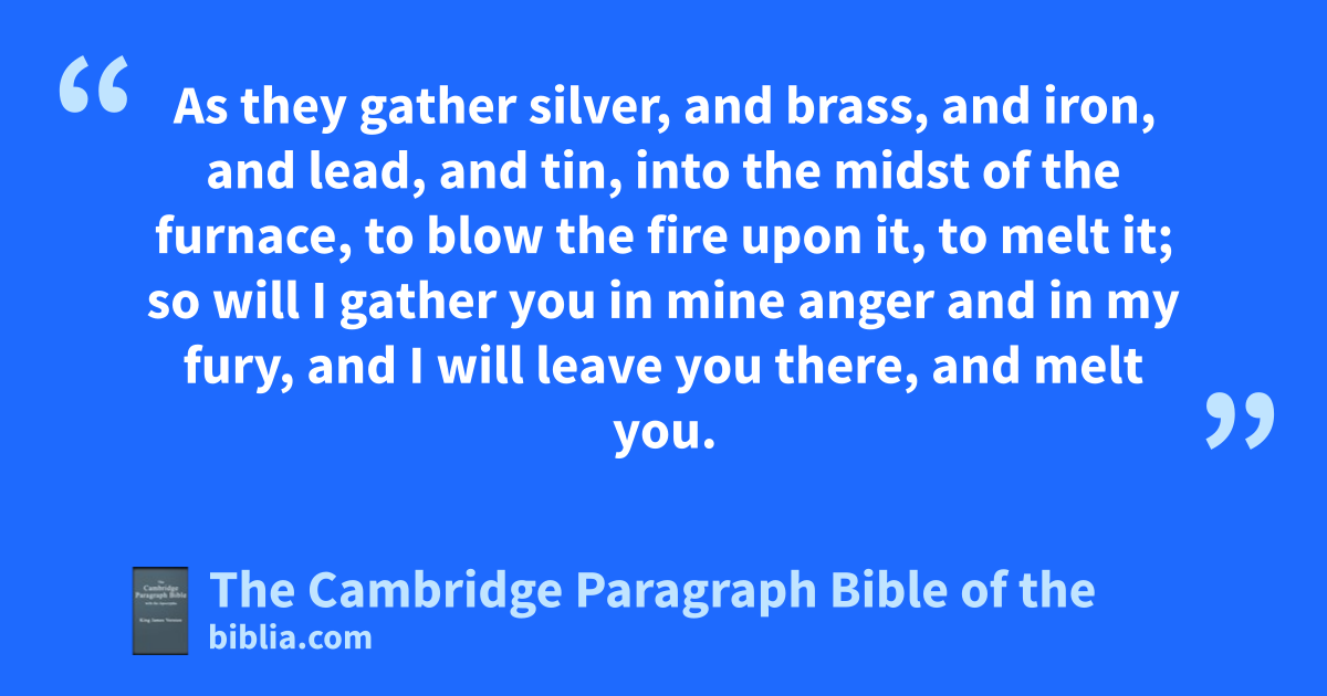 17 And the word of the Lord came unto me, saying, 18 Son of man, the house of Israel is to me become qdross: all they are rbrass, and stin, and riron, and lead, tin the midst of the furnace; they are even uthe * dross of silver. 19 Therefore thus saith the Lord God; Because ye are all become qdross, behold therefore, I will gather you into the midst of Jerusalem. 20 * As they gather silver, and rbrass, and riron, and lead, and stin, tinto the midst of the furnace, vto blow the fire upon it, to melt it; so will I gather you win mine anger and in my fury, and I will leave you there, and melt you. 21 Yea, I will gather you, and vblow upon you xin the fire of my wrath, and ye shall be melted in the midst thereof. 22 As silver is melted tin the midst of the furnace, so shall ye be melted in the midst thereof; and ye shall know that I the Lord yhave poured out my fury upon you.