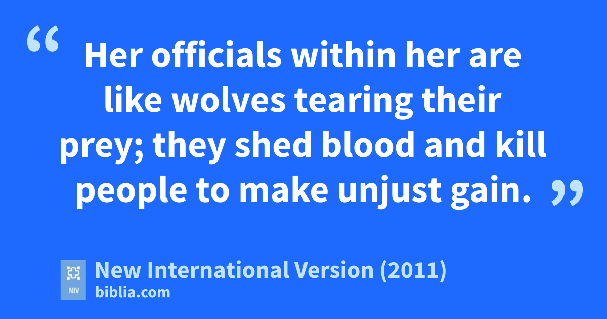 23 Again the word of the Lord came to me: 24 “Son of man, say to the land, ‘You are a land that has not been cleansed or rained on in the day of wrath.’z 25 There is a conspiracya of her princesb within her like a roaring lionb tearing its prey; they devour people,c take treasures and precious things and make many widowsd within her. 26 Her priests do violence to my lawe and profane my holy things; they do not distinguish between the holy and the common;f they teach that there is no difference between the unclean and the clean;g and they shut their eyes to the keeping of my Sabbaths, so that I am profanedh among them.i 27 Her officialsj within her are like wolvesk tearing their prey; they shed blood and kill peoplel to make unjust gain.m 28 Her prophets whitewashn these deeds for them by false visions and lying divinations.o They say, ‘This is what the Sovereign Lord says’—when the Lord has not spoken.p 29 The people of the land practice extortion and commit robbery;q they oppress the poor and needy and mistreat the foreigner,r denying them justice.s