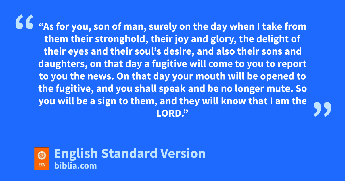 25 “As for you, qson of man, surely on the day when I take from them rtheir stronghold, their joy and glory, the delight of their eyes and their soul’s desire, and also their sons and daughters, 26 son that day a fugitive will come to you to report to you the news. 27 On that day your mouth twill be opened to the fugitive, and you shall speak and be no longer mute. uSo you will be a sign to them, and vthey will know that I am the Lord.”
