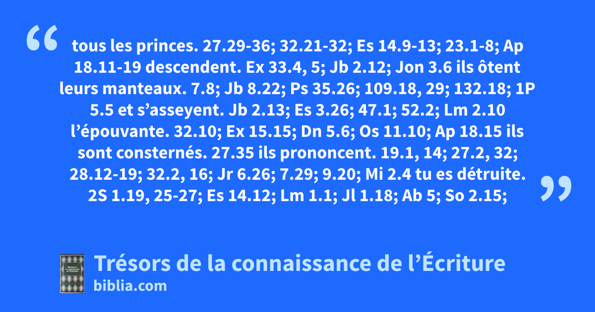 tous les princes. 27.29-36; 32.21-32; Es 14.9-13; 23.1-8; Ap 18.11-19 descendent. Ex 33.4, 5; Jb 2.12; Jon 3.6 ils ôtent leurs manteaux. 7.8; Jb 8.22; Ps 35.26; 109.18, 29; 132.18; 1P 5.5 et s’asseyent. Jb 2.13; Es 3.26; 47.1; 52.2; Lm 2.10 l’épouvante. 32.10; Ex 15.15; Dn 5.6; Os 11.10; Ap 18.15 ils sont consternés. 27.35