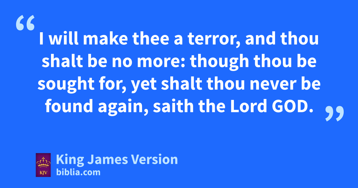15 Thus saith the Lord God to Tyrus; Shall not the isles xshake at the sound of thy fall, when ythe wounded cry, when the slaughter is made in the midst of thee? 16 Then all zthe princes of the sea ashall come down from their thrones, and alay away their robes, and put off their bbroidered garments: they shall clothe themselves with †trembling; abbthey shall sit upon the ground, and cshall tremble dat every moment, and ebe astonished at thee. 17 And fthey shall take up a lamentation for thee, and say to thee, How art thou destroyed, that wast inhabited †of seafaring men, the renowned city, gwhich wast strong in the sea, she and her inhabitants, hwhich cause their terror to be on all that haunt it! 18 Now ishall the isles tremble jin the day of thy fall; yea, the isles that are in the sea shall be troubled at thy departure. 19 For thus saith the Lord God; When I shall make thee a desolate city, like the cities that are not inhabited; jjwhen I shall bring up the deep upon thee, and great waters shall cover thee; 20 When kI shall bring thee down with them that descend into the pit, kkwith the people of old time, and shall set thee kin the low parts of the earth, in places ldesolate of old, kwith them that go down to the pit, that thou be not inhabited; and I shall set glory min the land of the living; 21 nI will make thee †a terror, nand thou shalt be no more: othough thou be sought for, yet shalt thou opnever be found again, saith the Lord God.